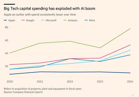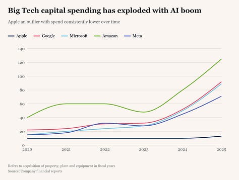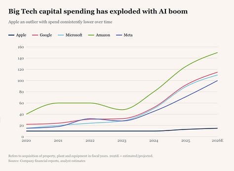 While the FT article on the Apple/Google Gemini deal gives us the Big Tech CapEx charts through 2024, I used my new friend Claude to plug in the 2025 numbers and even extrapolate out to 2026. Wild to see Apple in this context.
