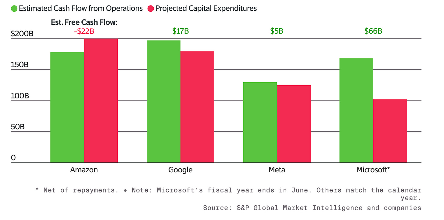 The Information ran the most recent CapEx numbers from Big Tech and showcased just how close they are to running beyond their cash flows — or actually over them, in Amazon’s case. Let there be debt! Strange new methods that make auditors uncomfortable! Bonds! 100 year ones! Everyone but Apple!